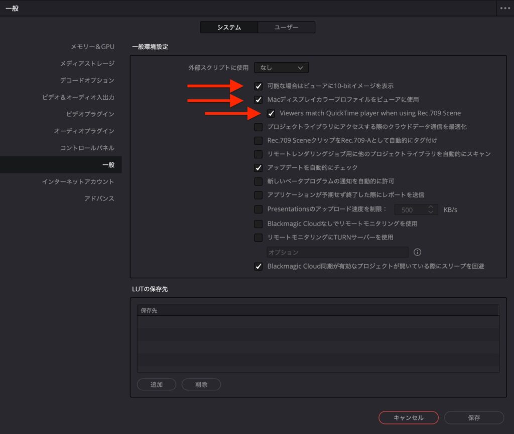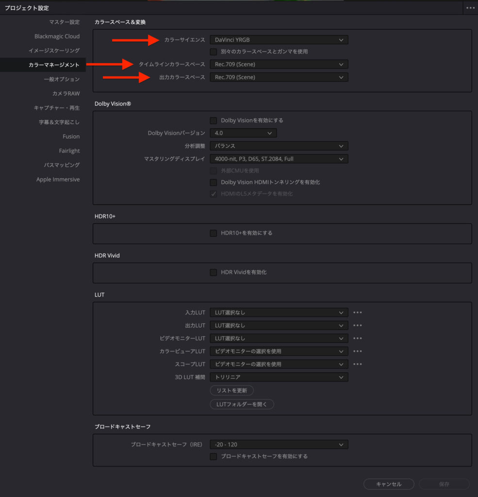 - カラーサイエンス を 「DaVinci YRGB」 に変更